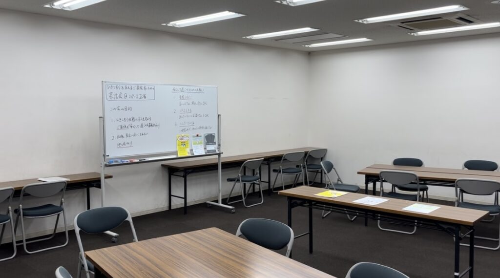 ひきこもりを支えるご家族のための居場所活動です。正雀市民ルームの第2会議室で開催しています。お菓子とお茶を準備しています。