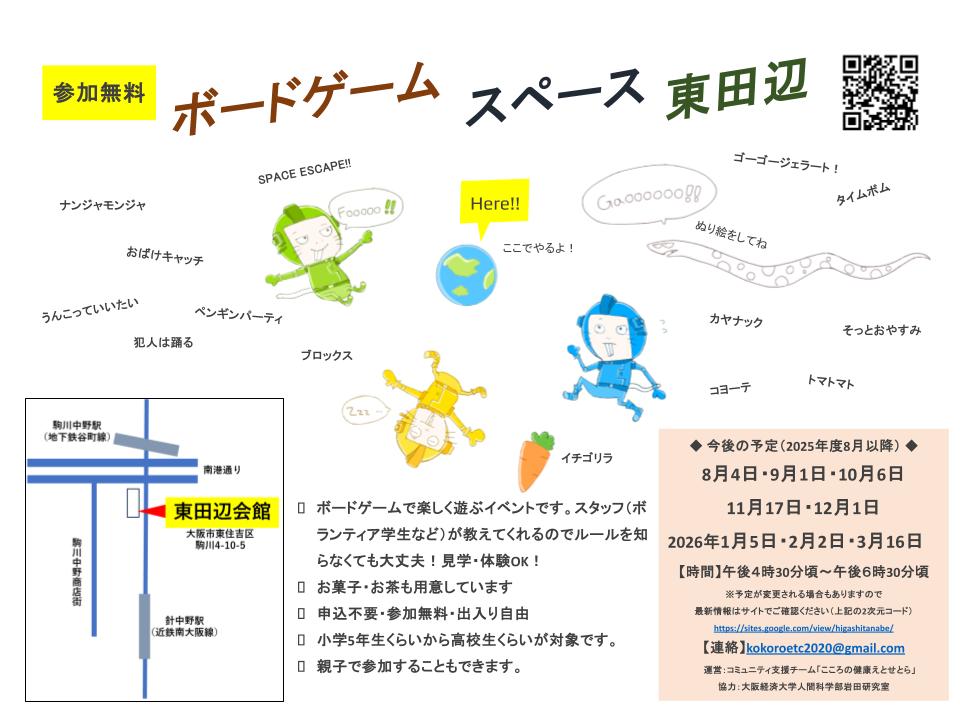 参加無料・出入り自由。見学だけでもOK! お菓子・お茶も用意しています。ボランティアの大学生等がやさしく教えてくれるのでゲームのルールを知らなくても大丈夫!もちろんやりたいゲームがある場合は持ち込みも可能です!